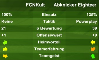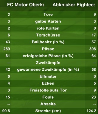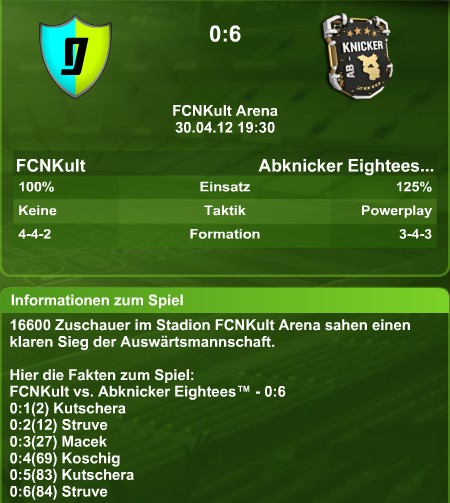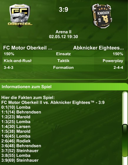 Seit Mittwoch, nach dem grandiosen 9:3 Auswärtssieg gg Oberkeil, stehen die Abknicker Eightees da, wo ma es nicht für möglich gehalten hat, auf Platz 1 der deutschen Eliteliga. Die Tabelle wird natürlich gleich festgehalten, wer weiss wie lange man sich auf Platz 1 sonnen darf. Oberkeil, in HZ 1 förmlich überrannt, hatte nicht den Hauch einer Chance und wurde mit ihrer höchsten Vereinsniederlage in die eigenen Katakomben geschickt. Lomba, mal wieder ein Garant des Erfolges mit 4 Treffern, zeigte mal wieder sein Können. In dieser Verfassung wird es nur eine Frage der Zeit sein bis sein zum Ende der Saison auslaufender Vertrag nochmals verlängert wird.
