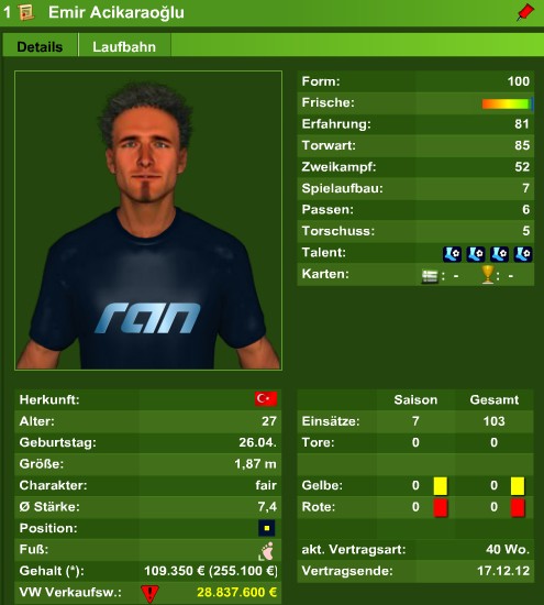 Acikaraoglu kam in Saison 5, im Alter von 23 Jahren zu den Abknickern und fortan Stammtorwart. Seine Skills waren damals TW81, ZW29, SP3, PA2, TO2 und Erf28. Aktuell hat er noch 33 Wochen Vertrag und wird diesen auf jeden Fall erfüllen!