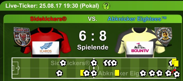 Geile Matches #16 – Pokalfight gg Sidekickers Veröffentlicht am 26. August 2017 von admin Antworten Bereits in der 4. Runde des Pokals der 31. Saison trafen die Abknicker auf die Sidekickers. Das vorweggenommene Finale! Die Abknicker konnten sich letzendlich mit 8:6 durchsetzen!