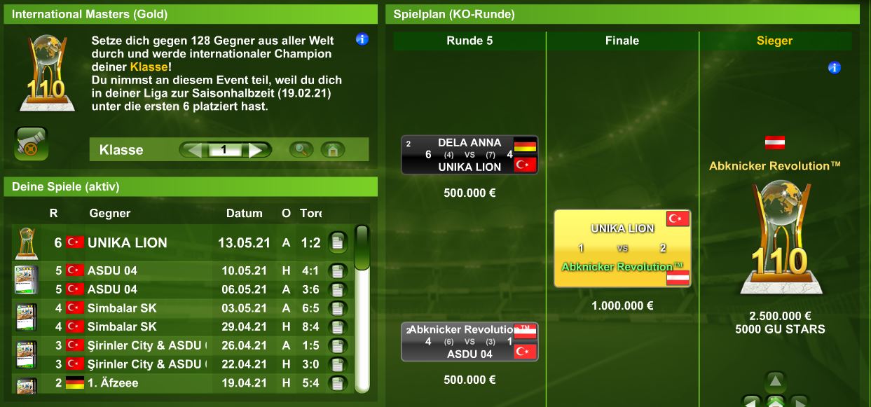 Revolution gewinnt International Masters 110 Klasse 1 Gold Veröffentlicht am 14. Mai 2021 von admin Antworten Nach Eightees und Reloaded haben auch Revolution den höchsten Internationalen Titel von Goalunited gewonnen.